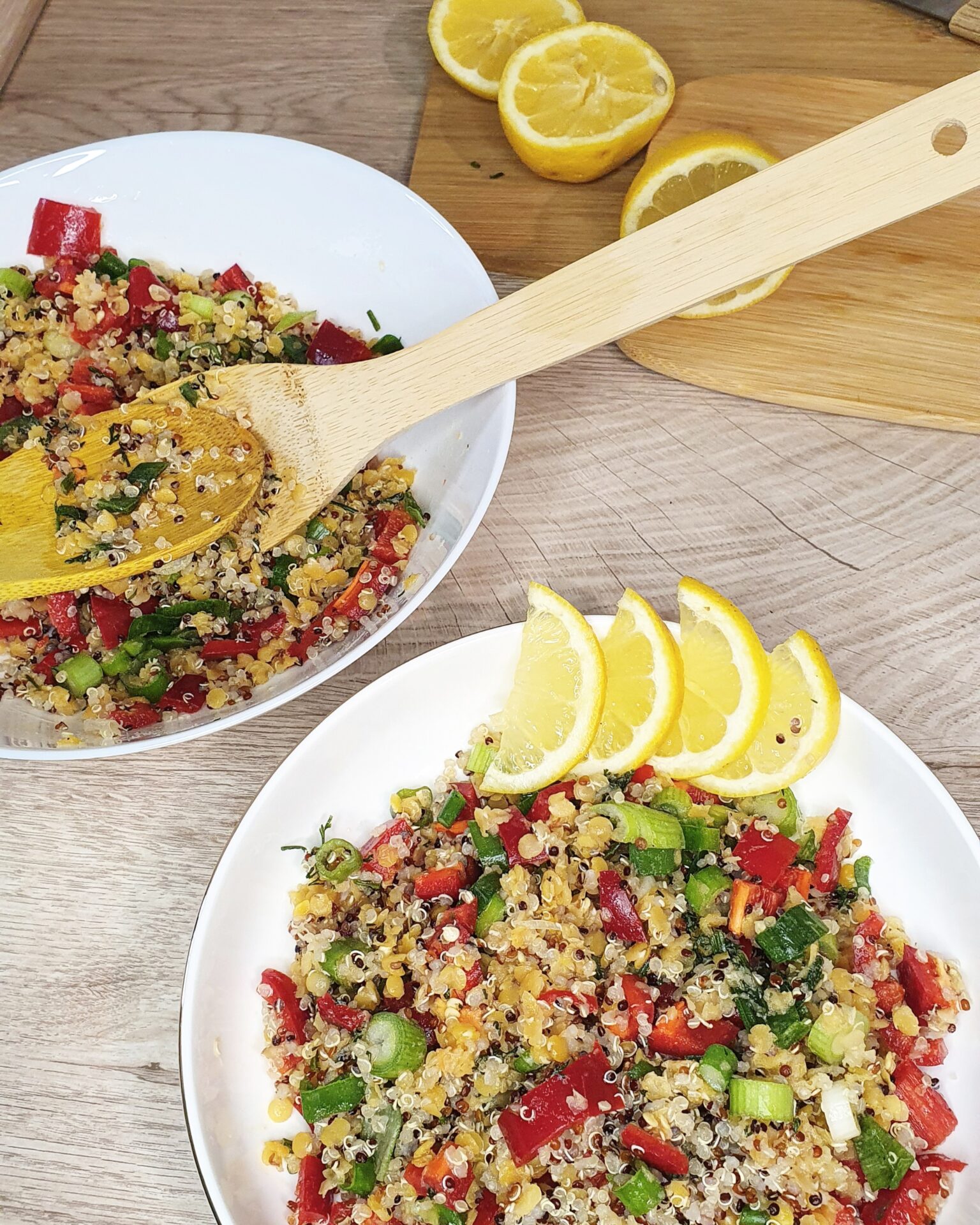 Quinoa und Linsen gut waschen und kochen (getrennt). Paprika und Lauchzwiebel klein schneiden. Gekochte Quinoa und Linsen abgießen und in einer Schalle mit dem Gemüse mischen. Die Gewürze, Öl und Zitronensaft dazu geben und genießen.