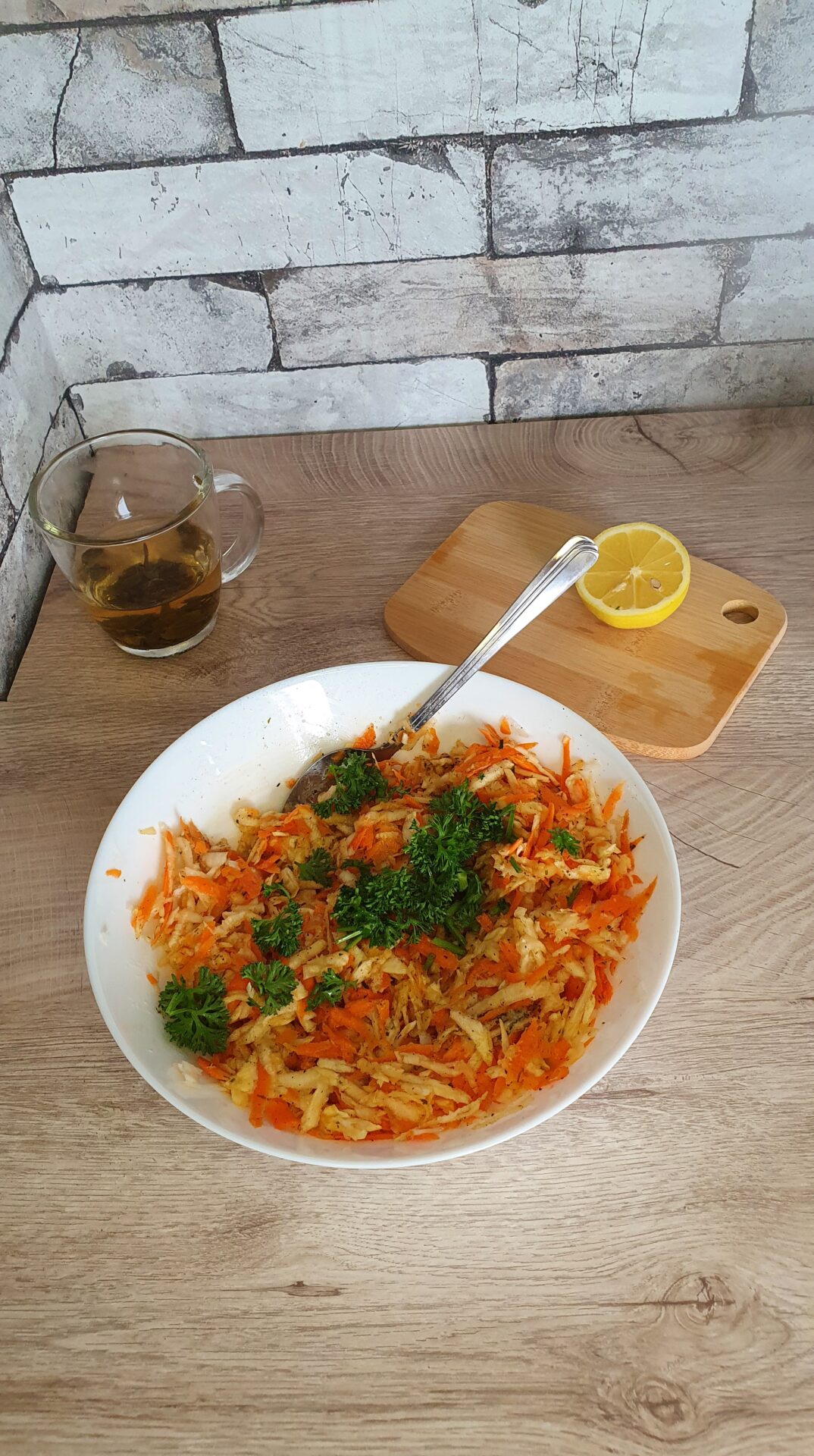 Sellerie und Karotten reiben und dann alle andere Zutaten zusammen mischen. Petersilie klein schneiden. Für Salat ist immer diese Reihenfolge wichtig: zuerst Öl, danach Zitronensaft und danach Gewürze.